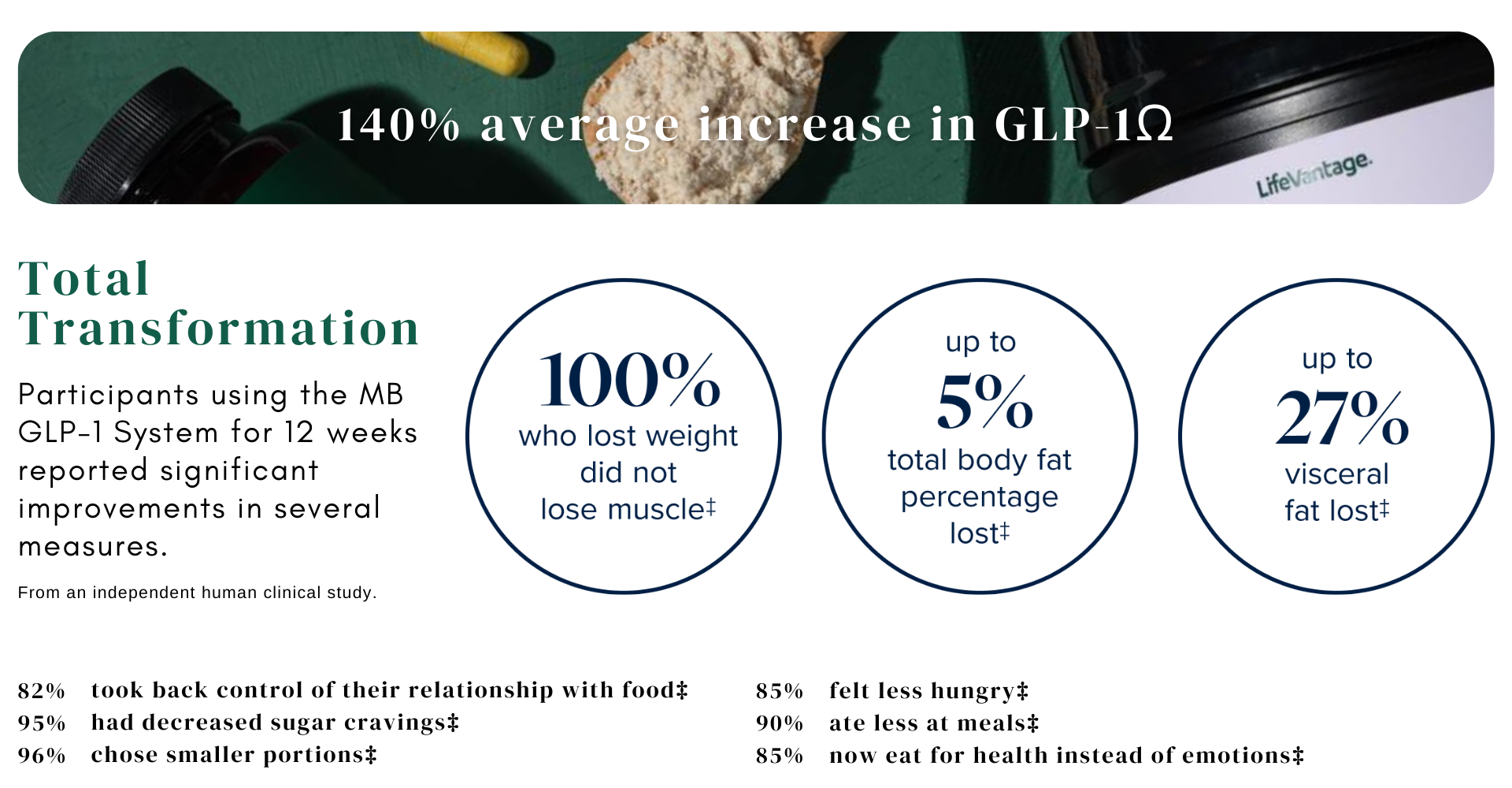 - Results based on a cell culture study on active ingredient blends in the MindBody GLP-1 System.