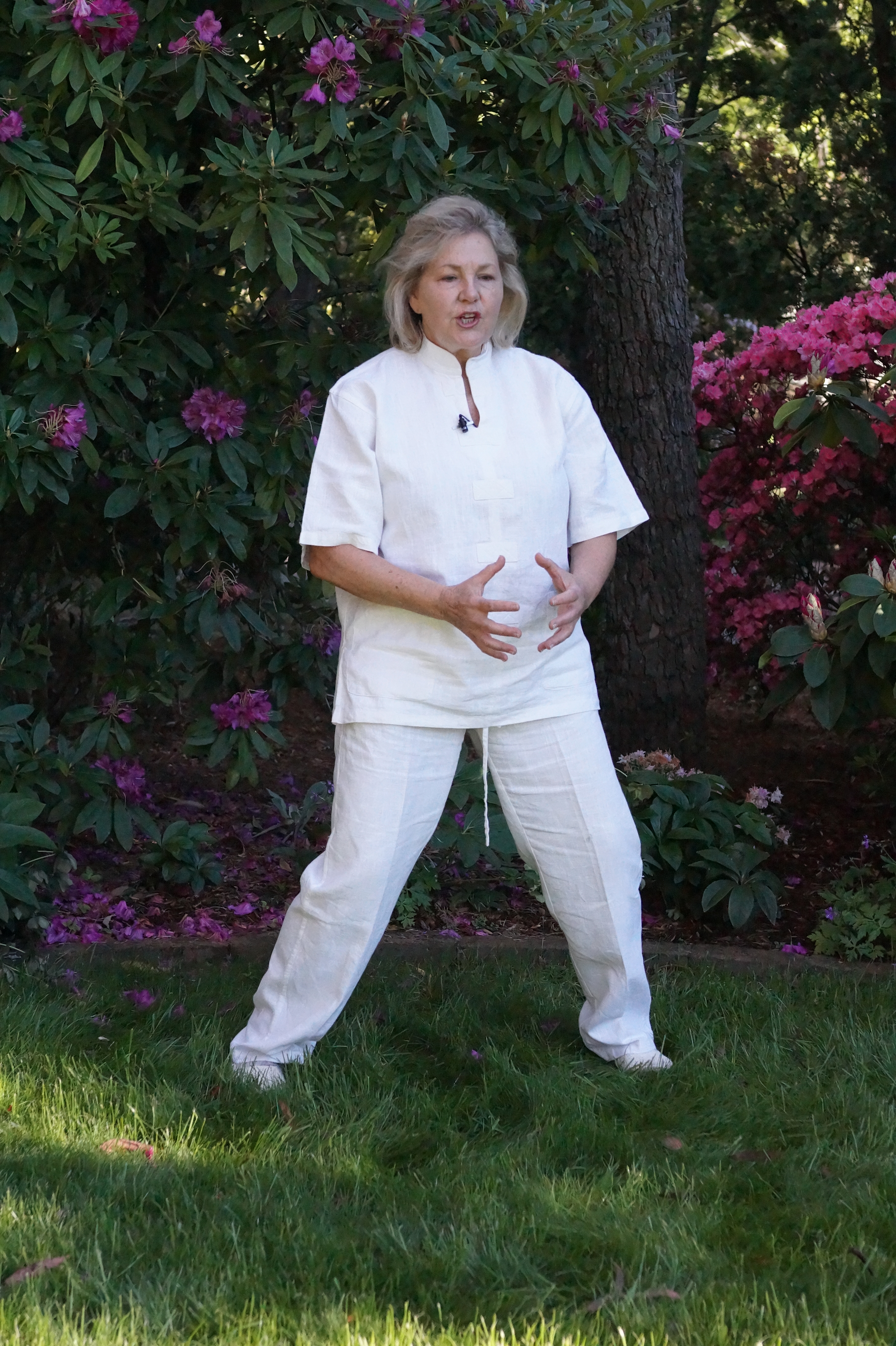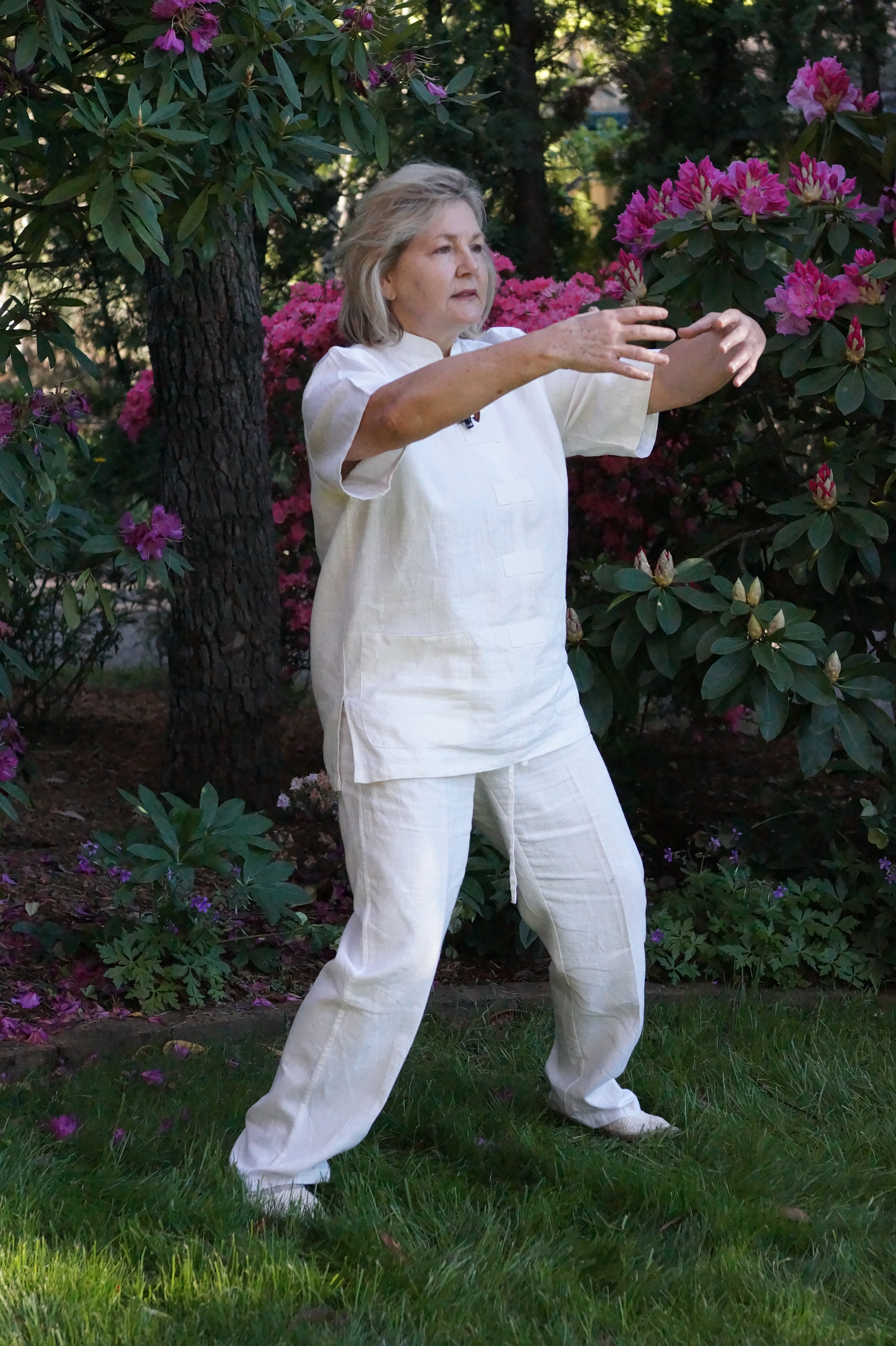 When practicing outside it is great fun and allows you to draw Qi from the sky , the earth beneath your feet, water and nature all around you. Imagine yourself as the antenna between earth and the sky bringing your body to a state of balance. When you practice daily whenever possible outside, you will start to feel stronger and notice an improvement in your energy levels.